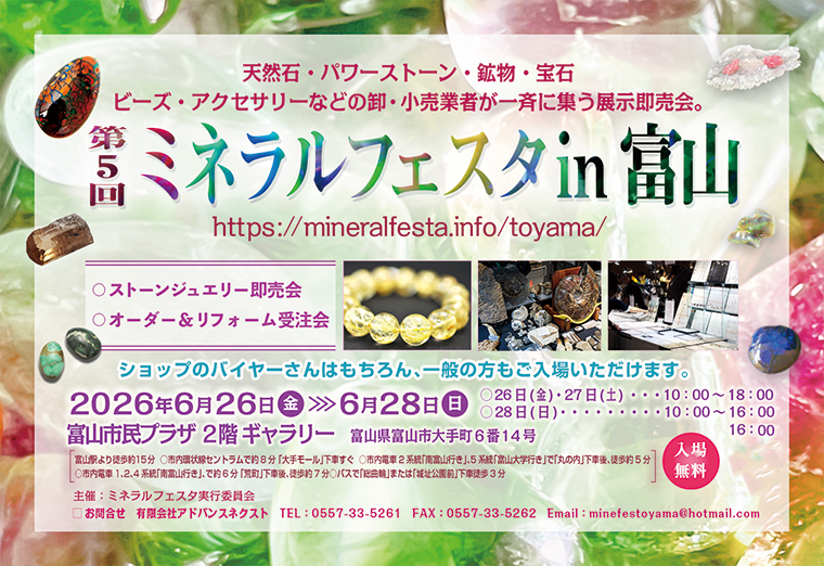 天然石・鉱物・宝石・化石・ビーズなどの卸・小売業者が一斉に集う展示即売会。